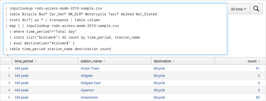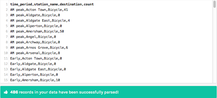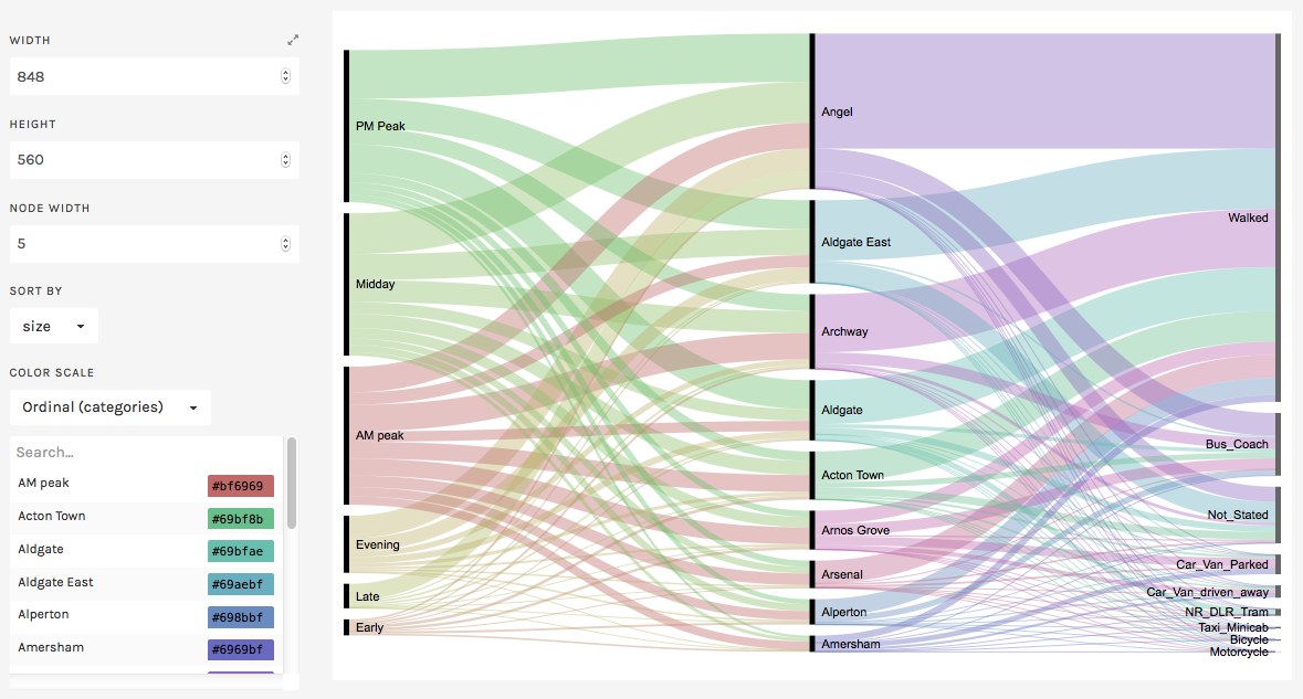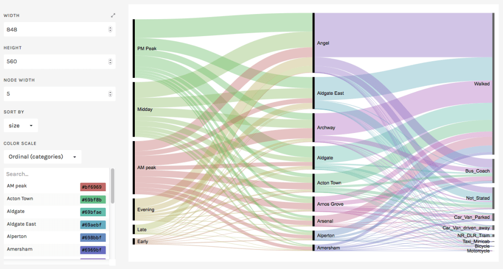Here’s the first example in action, reachable via Chart Examples menu. The data comes from Transport of London data portal, this specific data set (CSV) is a sample for the Rolling Origin & Destination Survey (RODS) available under “Network Statistics” section from the portal.