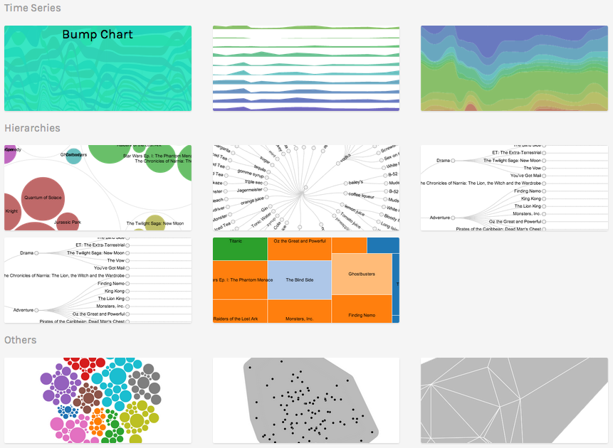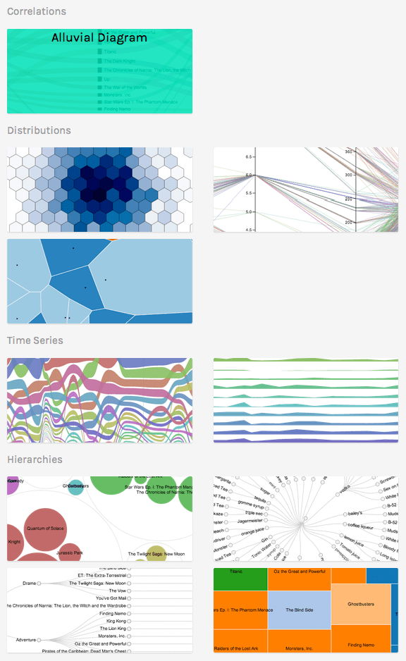 Here’s a list of currently supported charts/diagrams: Sankey / Alluvial, Bump Chart, Circle Packing, Circular / Cluster Dendogram, Clustered Force Layout, Convex Hull, Delaunay Triangulation, Hexagonal Binning, Parallel Coordinates, Reingold-Tilford Tree, Streamgraph, Treemap, Voronoi Tessellation.