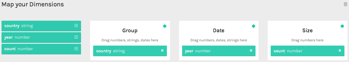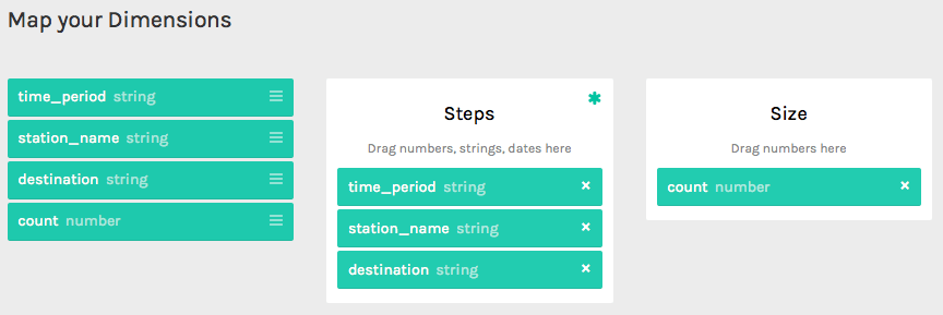 The next step is to select which fields (columns) will be part of the diagram/chart, and also how they will relate to the chart’s components (dimensions, steps, hierarchy, etc). For doing so, a nice drag and drop interface eases the job.