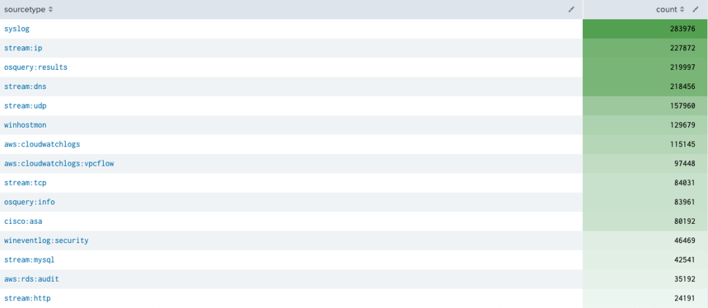 The important thing to know is that above query will run very fast while reaching the metadata from all events and providing us with a very good view on potential sourcetypes to narrow our search down.