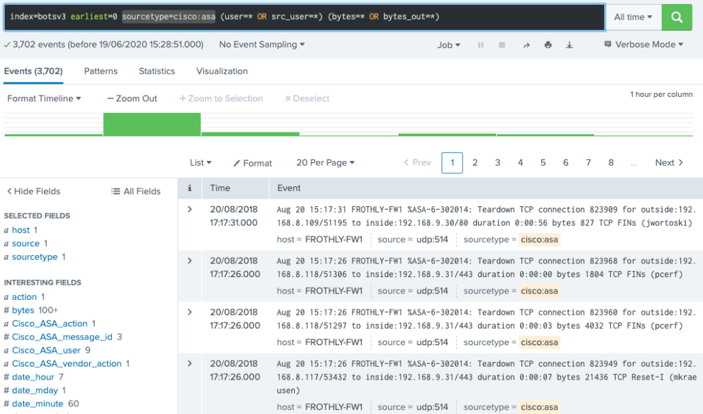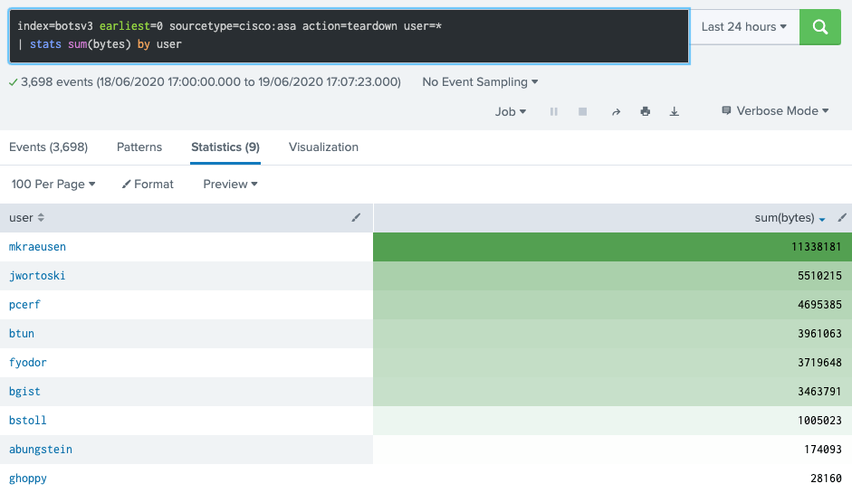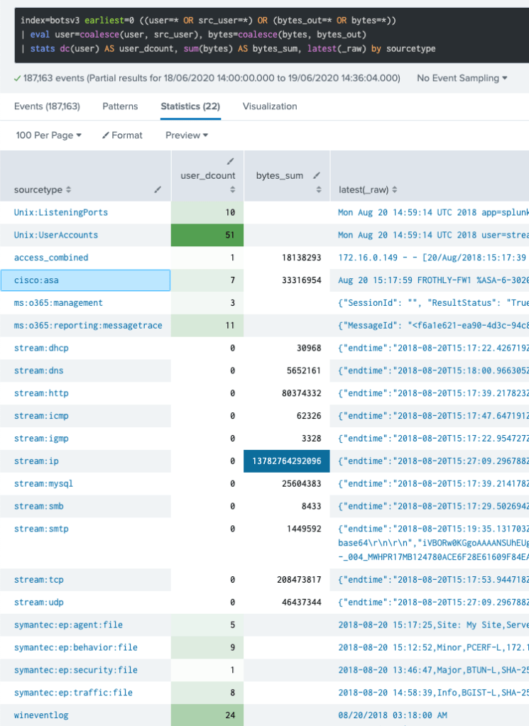 The results demonstrate that only 22 sourcetypes carry user and/or bytes info within their events. The EVAL’s coalesce() function assigns the first non-null value seen from the list of parameters, that means user is assigned with either user or src_user value. Same goes for bytes.