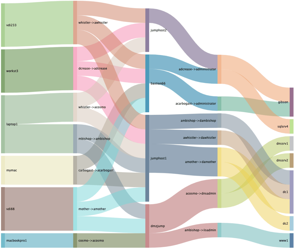 After a quick look at the chart, can you spot the inconsistency? All source/target user names look similar, except for one. Are whistler and cosmo users working from the same laptop1 host? Or maybe acosmo (cosmo’s administrative account) is compromised? π²