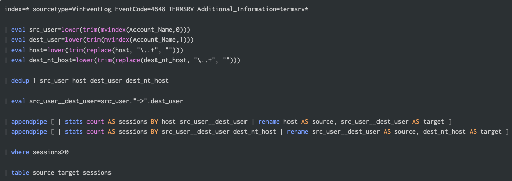 The following query leverages the string “TERMSRV” present in some 4648 eventlogs β which surprisingly carry not only the source of an RDP connection, but the target host and user account info.