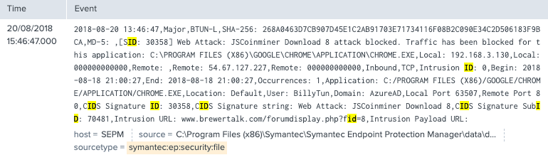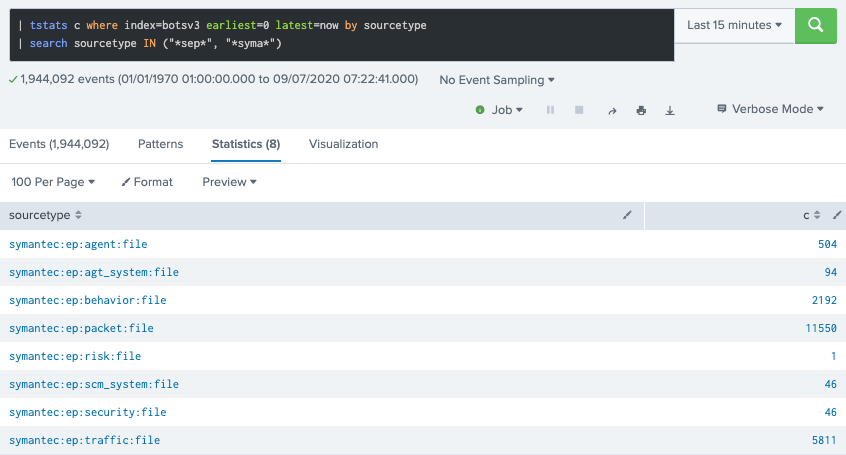 First we need to locate the Symantec events which is easily done by listing sourcetypes containing traces of Symantec or SEP (Endpoint Protection) related data: