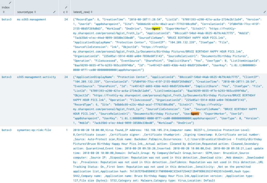 Next obvious move is to look for “agent” related fields from those events. If you look closely, the first hit indicates there must be agent related information at sourcetype = “ms:o365:management”: