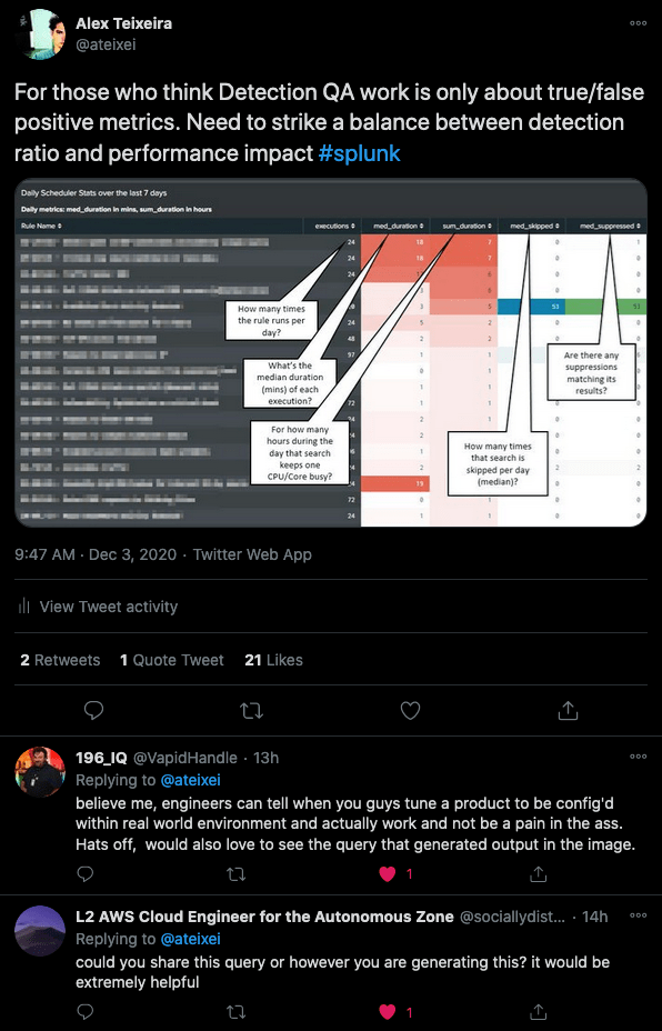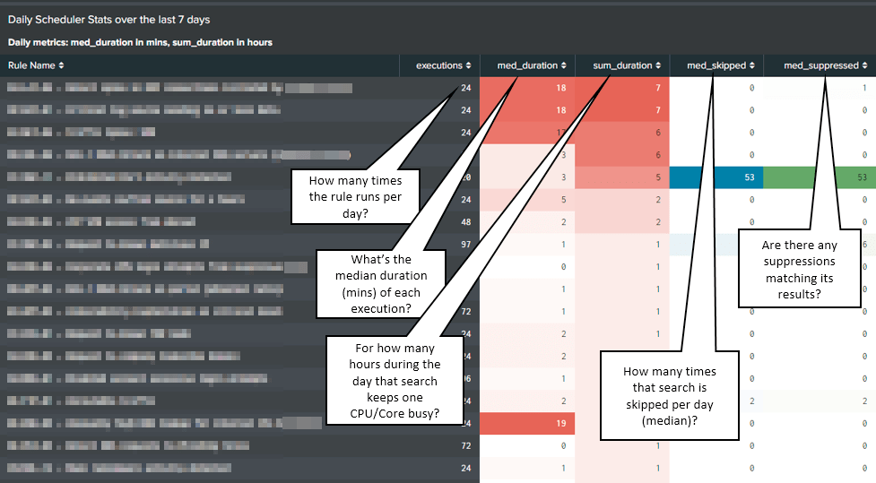 index=_internal sourcetype=scheduler savedsearch_name="* - Rule" scheduled_time=* | fields suppressed skipped run_time savedsearch_name | rename run_time AS duration | fillnull value=0 suppressed skipped | bin _time span=1d | stats count AS executions, sum(*) AS sum_*, median(*) AS med_* by savedsearch_name, _time | stats max(executions) AS executions, median(sum_*) AS sum_*, median(med_*) AS med_* by savedsearch_name | eval savedsearch_name=replace(savedsearch_name, "\S+ - (.+) - \S+$", "\1") | eval med_duration=round(med_duration/60) | eval sum_duration=round((sum_duration/60)/60) | table savedsearch_name executions *_duration med_skipped med_suppressed | rename savedsearch_name AS "Rule Name" | sort 0 -num(sum_duration), -num(med_duration)